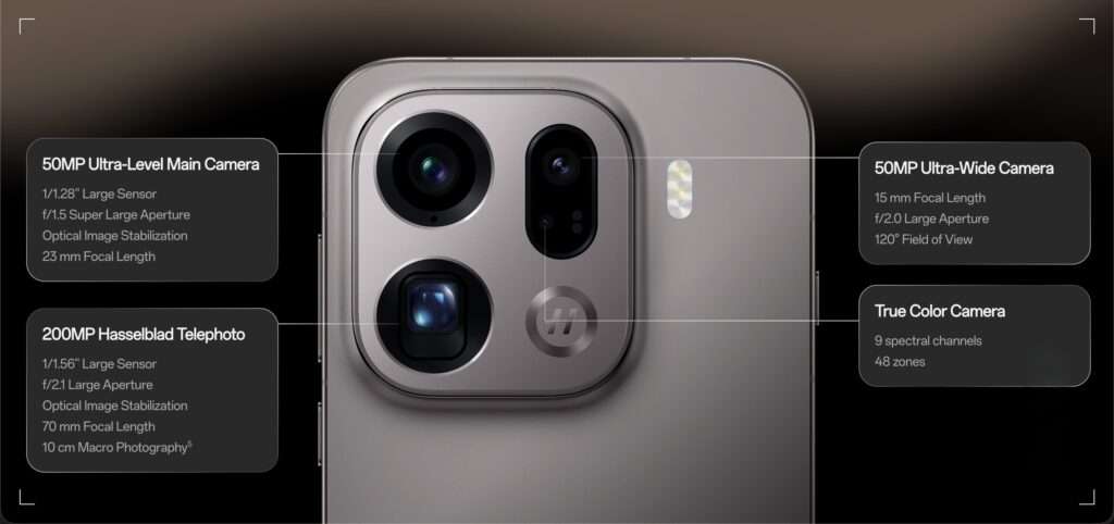 - Find X9: Triple 50MP array (main, ultrawide, telephoto) with OIS and Hasselblad colour tuning.